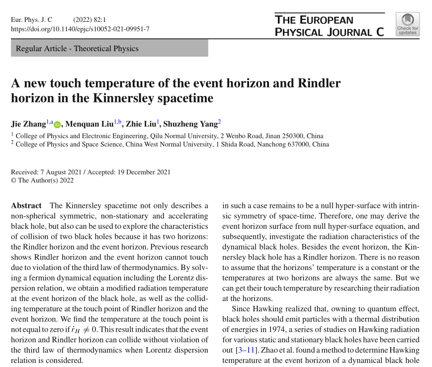新年伊始,贝博官网天体物理团队成员接踵在国际一流期刊上发表重要成果。张洁教授作为第一作者在《The European Physical Journal C》上发表题为“A new touch temperature of the event horizon and Rindler horizon in the Kinnersley spacetime”的论文,通过求解包含洛伦兹色散关系的费米子动力学方程,得到了黑洞事件视界处的修正辐射温度,以及Rindler视界和事件视界接触点处的碰撞温度。作者发现接触点的温度并不相等,这一结果表明当考虑洛伦兹色散关系时事件视界和Rindler视界可以碰撞而不违反热力学第三定律。
