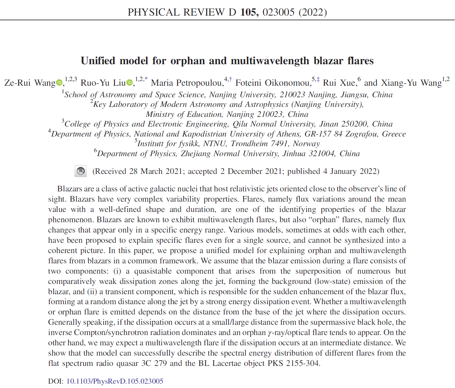 王泽睿博士作为第一作者在《Physical Review D》上发表题为“Unified model for orphan and multiwavelength blazar flares”的论文,基于近些年最新的观测结果,根据耀变体喷流的高分辨率观测特征构建了一个可以在同一框架下自洽地解释不同类型耀变体源耀发事件的随机耗散模型。之后将模型应用于两个类型不同的耀变体源观测能谱的拟合,作者发现随机耗散模型可以很好地重复实际观测能谱。最后还利用当前的一些其他观测特征,如:耀发持续时标,“孤闪”产生率,辐射的内部吸收以及观测到的辐射中心位移等对随机耗散模型进行了检验。作者首次将不同类型的耀变体耀发现象进行整合并尝试用统一的框架来解释,为相对论性喷流物理特征的认知大厦添砖加瓦。