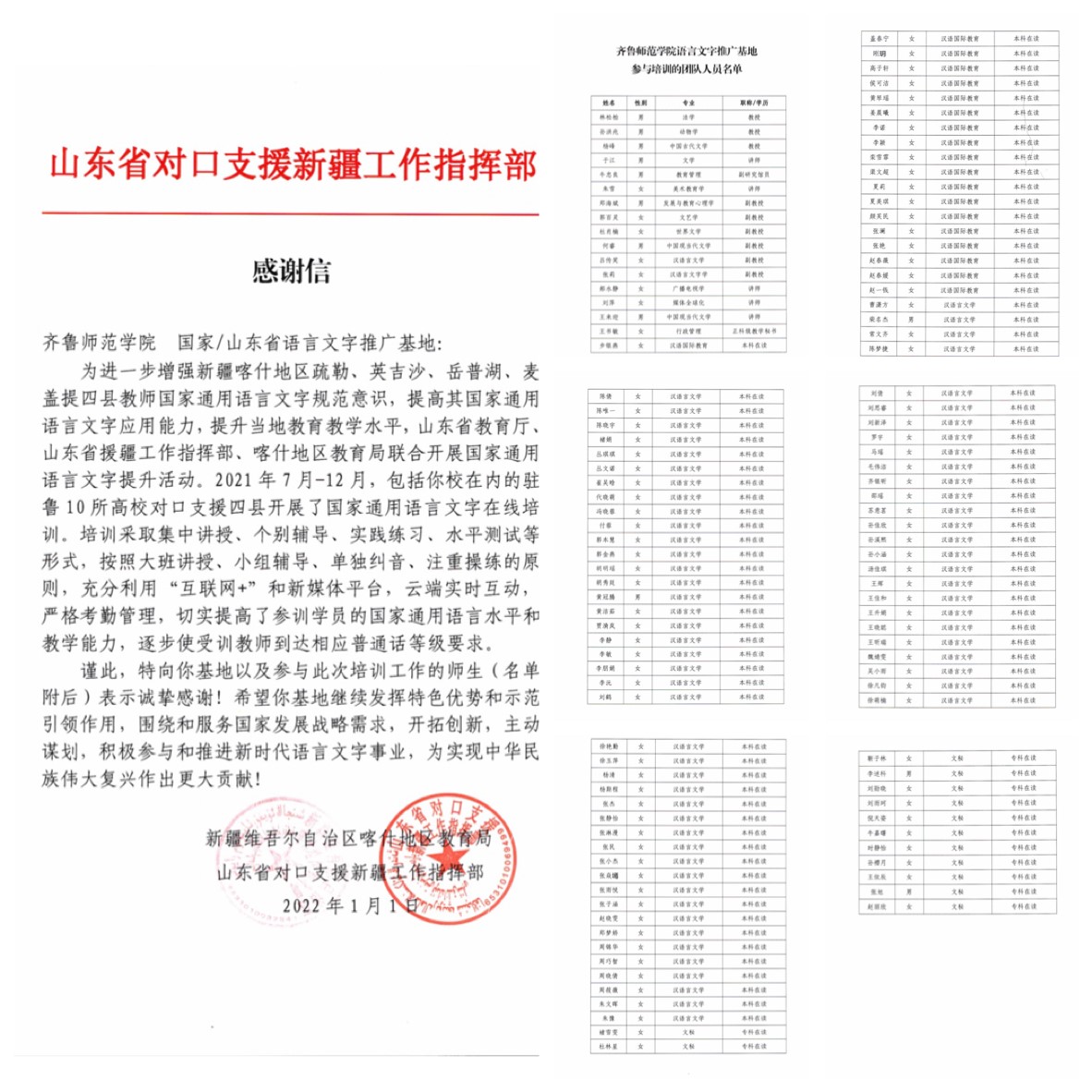 新疆维吾尔自治区喀什地区教育局、山东省对口支援新疆工作指挥部特向BB贝博艾弗森原官方网站(山东省语言文字推广基地)发来感谢信,向参与对口支援麦盖提县开展国家通用语言文字在线培训工作的师生表示诚挚感谢。