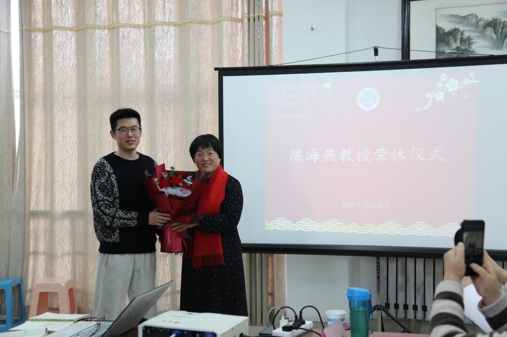 荣休仪式上,大家共同观看陈海燕教授从教生涯掠影,视频通过照片回顾的形式简洁明快、活泼生动地表现了陈海燕教授任教三十八年来教书育人的点点滴滴和课堂外的丰富生活,唤起了大家心中那段沉封已久的记忆,仿佛时光流转,重新回到了那段来时路。三十八载辛勤耕耘,三十八载奋力拼搏,三十八载硕果累累,三十八载桃李满园。现场响起热烈的掌声,气氛热烈。紧接着,林松柏为陈海燕教授颁发了荣休纪念品。学生代表向陈海燕教授献花,表达他们最真挚的谢意与敬仰。