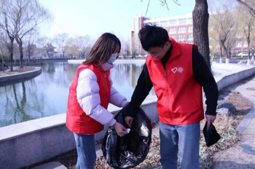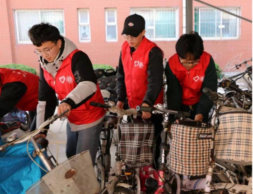 4日一大早,安静的校园内一抹抹红色的身影在穿梭忙碌着,他们或低着头将一辆辆杂乱停放的自行车摆放整齐,或弯下腰捡起的街角的纸片、烟头,或站在路边,向同学们宣讲雷锋精神……文脉湖畔、教学楼前、快递站点,“流动着的红马甲”,成为校园内靓丽的风景。